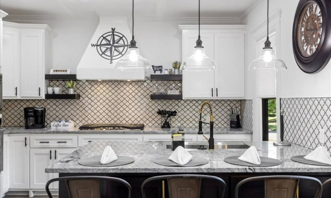 This chef's kitchen is a perfect blend of style and function. It features top-notch appliances, a spacious cooking area, and an inviting island with bar seating for social gatherings. Clever storage and thoughtful lighting enhance the space's efficiency. It's an elegant, vibrant kitchen that's ideal for both cooking and entertaining.