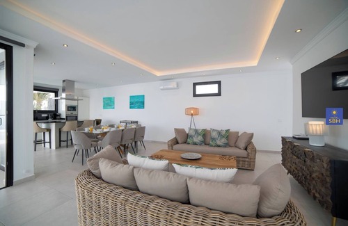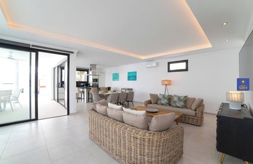 The property has been designed to create a feeling of light, space and complete relaxation, with floor to ceiling windows throughout. The spacious, open plan kitchen, dining and living room area provides clear views of the sun and pool terraces with four of the bedrooms having sliding patio doors directly out onto the pool terrace.