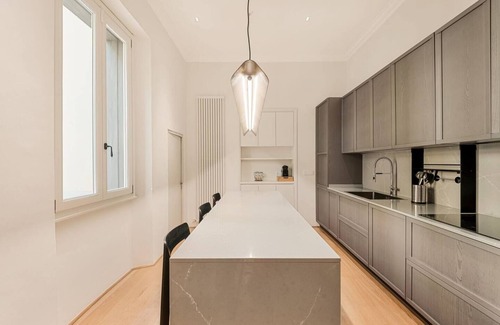 Throughout the residence, the dialogue between history and modernity unfolds with elegance. Designer lighting by Flos and Davide Groppi subtly illuminates architectural details and centuries-old frescos, while contemporary parquet flooring grounds the space in a warm, tactile modernity. The living area is a curated composition of form and function: refined Shybuia armchairs by Misura M Spa, an original Ignazio Gardella bookcase — a celebrated icon of Italian modernism — and a minimalist dining table by True Design, winner of the Archiproducts Design Award, all coexist in harmony. Carl Hansen vintage chairs, timeless examples of Danish craftsmanship, further elevate the ambiance with a discreet international flair. A modern smart TV is seamlessly integrated, offering innovation without disrupting aesthetic balance.