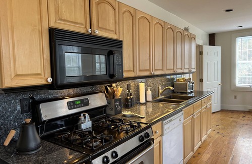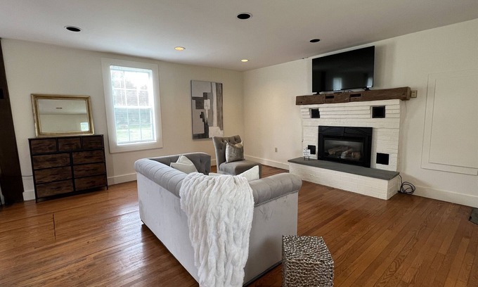 The main house has 4 other bedrooms all are on the 2nd floor, and accessed from the beautiful center staircase in this classic center hall colonial home. The first floor also has a large living room with a sectional sofa, SmartTV and a ping pong table (not pictured). A large kitchen is just across the hall and perfect for making meals for a large group. If you forgot some basics for dinner, never fear, there is a great local General Store just down the road in walking distance. There is a full bath on the first floor with a shower just off the hallway. Off the kitchen and center hallway is backdoor that leads to the outside patio area with gas grill, outdoor dining tables and chairs. A large flat back yard is just beyond the patio and great for evening games of wiffleball, or you can enjoy Cornhole and Can Jam provided by your host.