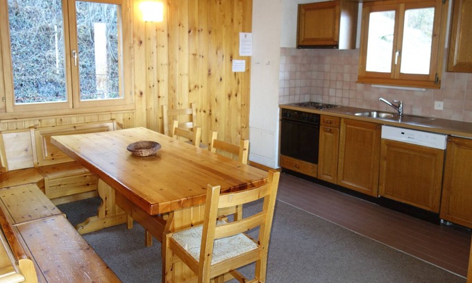 3* chalet for 10 people with 6 rooms. Bright living room with fireplace, cable flat screen TV. Open kitchen equipped with fridge and freezer compartment, oven, filter coffee machine, kettle, dishwasher. Large dining table for 10 people.