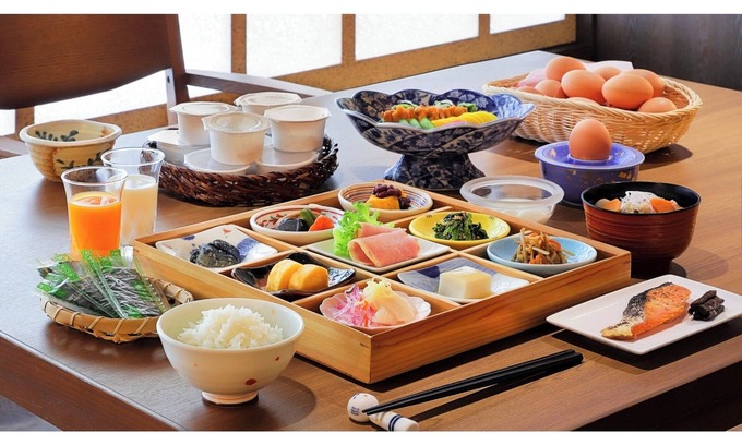 Enjoy a relaxing soak in the hot springs and enjoy a breakfast of plump rice and a Japanese set meal featuring local Miyagi side dishes