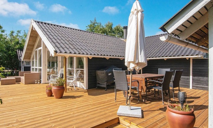 Holiday home located right where the forest meets with fjord and beach at Bork Harbor. The house is i.a. Equipped with whirlpool and sauna as well as heat pump / air conditioning, wood burning stove and blu-ray player. For the kids there is a small playhouse and a nice big lawn where they can play ball. Not for rent to youth groups. A refundable deposit might be charged closer to your check-in date. This deposit covers utilities consumed during your stay and any additional services that may be taken. The final amount will be adjusted based on actual meter readings, actual usage of extra services, and any remaining balance will be refunded within 21 days after checkout.
