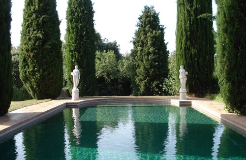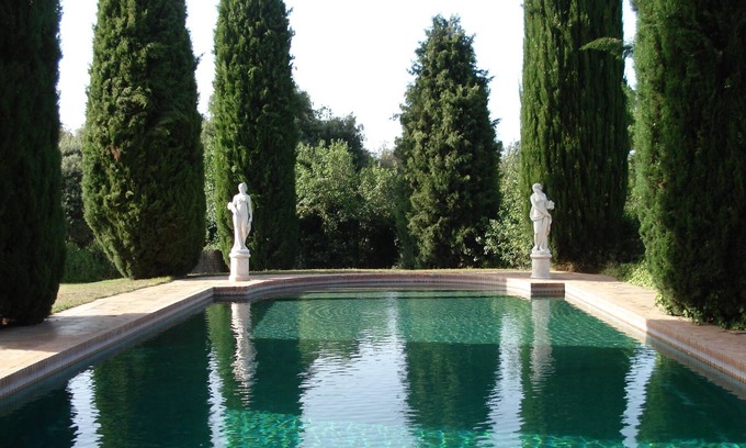 There is a pool 8 meters wide by 18 meters long surrounded by cypresses.