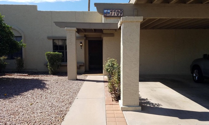 Welcome to Fountain of the Sun a gated adult community at 80th St and Broadway in Mesa. 2 bedrooms, one with a king bed and one with a queen bed. 2 full bathrooms. One car carport. For those few that have never experienced staying in an adult community this one has all the supplies (sheets, towels, dishes) and amenities. Social gatherings, activities from pottery making, to stained glass plus other crafts, computer club, shuffleboard, and the new pickle ball courts and of course golfing. Why chose our home? Simply for the feel of being home and the feeling of belonging to a great community. Another benefit of our home is the convenience of local hospitals, restaurants, Costco for those deal shoppers. Once you are through shopping time to relax next to the pool and spa. The heated hot tub takes away all your worries, leaving you totally relaxed. Updated in summer of 2017 with all new paint and popcorn finish off the ceilings, new door hardware, new shutters in kitchen and guest room, new lights and white rocker switches, new brown leather couch (not a fold out), new pots and pans, and many more updates.
