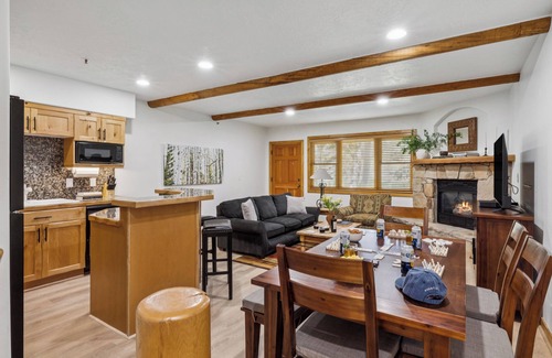 The inviting living room features a plush sofa, a crackling fireplace, and a flat-screen TV—perfect for unwinding after a day on the mountain. A full kitchen and dining table for six make it easy to gather for meals or après-ski storytelling over hot cocoa or wine.