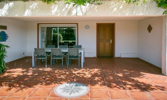 Private covered terrace furnished with table, chairs and BBQ leading to lounge/dining room.