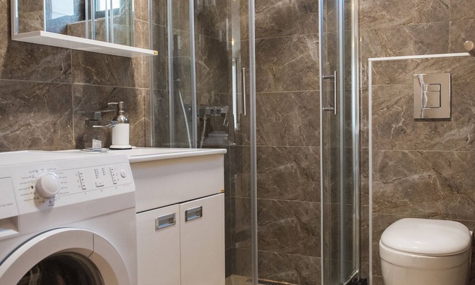 Available amenities: refrigerator, TV, heating, air conditioning, stove, oven, shower, washing machine, towels, bed linen, iron, ironing board, dishes, kettle.