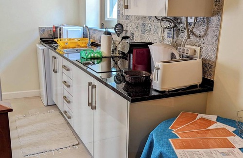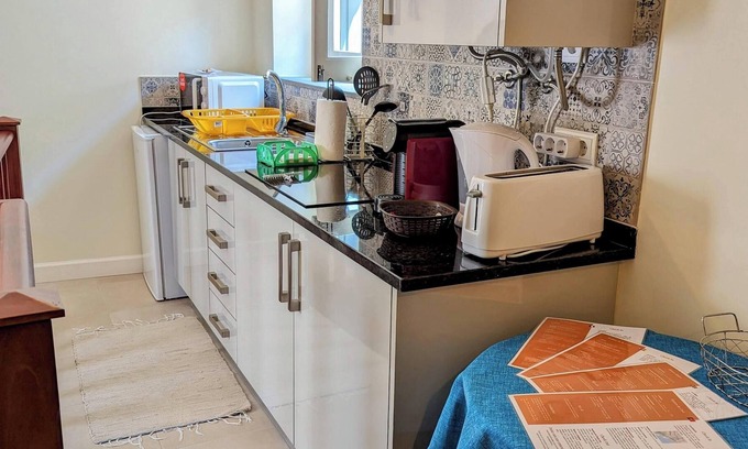 A highlight of this apartment is its fully-equipped kitchenette, complete with modern appliances and all the essentials you need to whip up delicious meals. Enjoy your creations in the dining area, which provides a welcoming space for sharing meals and stories.