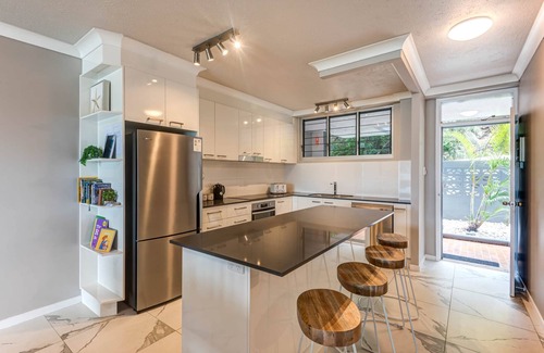 The main bedroom boasts absolutely stunning views over Catseye Beach and its own en-suite bathroom, with direct access to the patio. The second bedroom features a queen bed and a single bed, with the second bathroom conveniently located right next door.