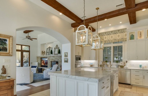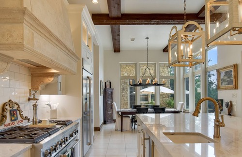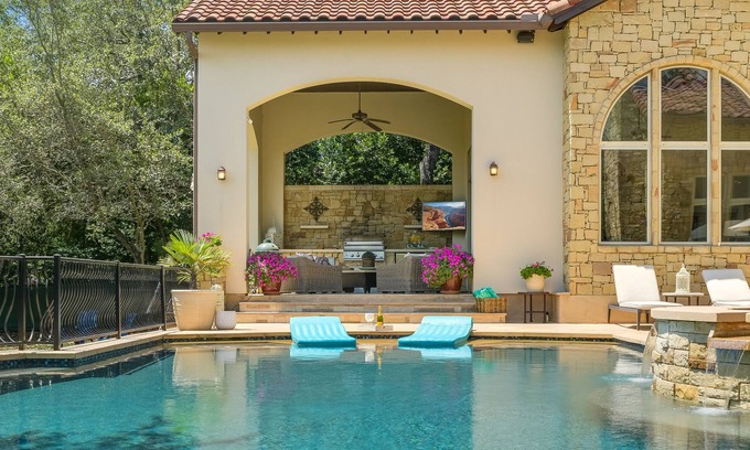 Just a short drive from downtown Austin, the ABOVE Villa Bonita Estate offers your own private oasis with an elegant Spanish flair. The private backyard is like having your own slice of the Texas Hill Country. Enjoy the pool and hot tub in this private setting or play ping pong poolside. Grill on the patio and dine by the patio fireplace or lounge while watching the game. Inside, a walk-through bar is the perfect spot for a welcoming margarita bar. With an open floor plan and floor to ceiling windows in the spacious dining, kitchen and living areas, you can relax, visit, and enjoy those private views. Enjoy the media room upstairs as you watch a movie with your friends and family. There is exercise equipment you are welcome to use as well as a desk should you need to get a little work done during your visit.
