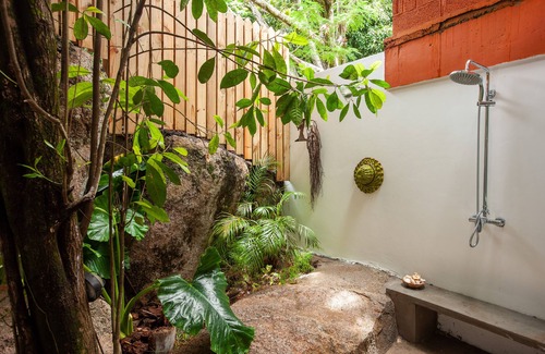 Guests are invited to relish an independent open living room and indulge in the ensuite bathroom, which boasts a private outdoor shower. This unique feature allows guests to shower under the open sky, gazing at the stars and embracing the surrounding natural beauty.