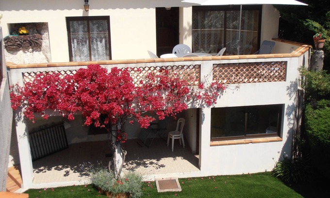 2 room apartment, 2 to 4 people, garden, south facing, large terrace, close to all shops and bus stop. equipped kitchenette, oven, microwave, living room with sofa bed 2 places, tv, bedroom with double bed, bathroom with shower, toilet and bidet, washing machine. wifi internet access. rent week, fortnight or month ............................................ .................................