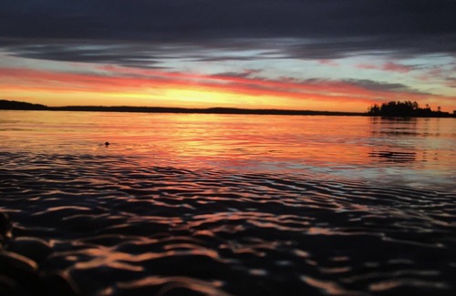 The beach is not sand but large, smooth pebbles with about 3-4 ft of beach and high tide and 20ft or so at low tide. The sunrise views are incredible, with the sun coming up over Lopez island, sunsets in the summer get a warm orange glow coming from Lopez and Dinner Islands.