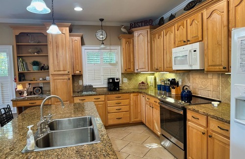 The open floor plan features a great room with living, dining and kitchen areas all overlooking the lake. The master bedroom enjoys a private balcony also overlooking the lake. This home has all of the contemporary conveniences for your comfort. It has a separate room for the children with their own TV and foosball table. Every bedroom has a Roku enable TV. The decor is a delightful mix of antique oak and contemporary items.