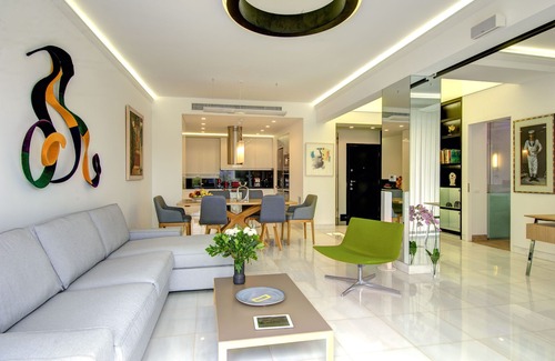 *Spacious living room and dining room featuring marble tiles. Fully equipped kitchen including hi-tech inox appliances as well as a wine cooler.