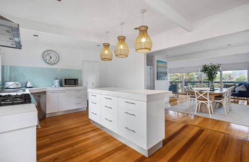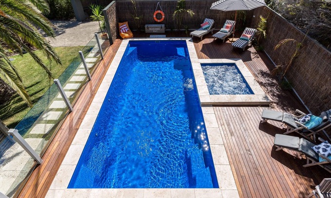 This home is spacious and comfortable, and feels like a private resort! Featuring 2 outdoor decks at the front and back of the home with water glimpses and trees top views, you can enjoy alfresco dining under the stars or choose to dine inside by the gas log fireplace. Relax on the sun lounges by the huge solar heated pool and heated spa, or snuggle up on the comfy sofas to enjoy your latest holiday read or movie on Netflix or Foxtel.