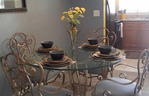 Fully furnished with coffee maker, dishes, silverware, in room safe, fire extinguisher, property surveillance with exterior security cameras, welcome packet of coffee, teas, soap and shampoo. Pots, Pans and all the utensils to prepare your own meals should you decide to do so.