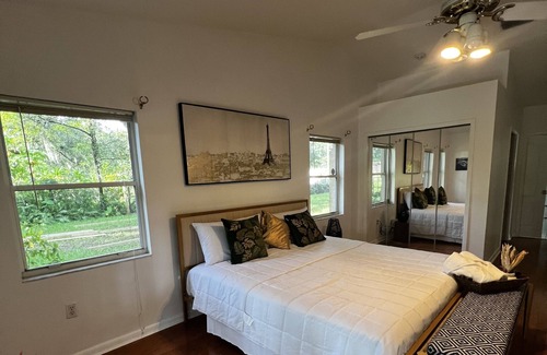 Forget your worries in this spacious and serene space. With 3 bedrooms, 2 bathrooms, large patio, outdoor terrace, total comfort and relaxation for you and your family, 6 people in bed, 1 person on a large sofa that can be used as a bed, You have access to the entire premises except for a suite built in the garage, which is currently occupied and has a separate entrance. However, you will not share space with any other guests in the main house.