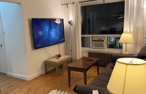 1 bedroom apartment, steps to TTC Bus Stops, Toronto Library, Grocery Stores,Coffee Shops. Building has a free laundry. Apartment equipped with all amenities, high speed wifi, 65" TV, Sofa bed in living room for extra sleeping space, dining table for 4, centrally heated. 3rd floor with a wide main road view.