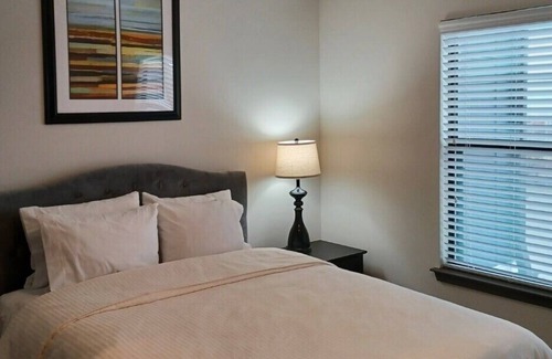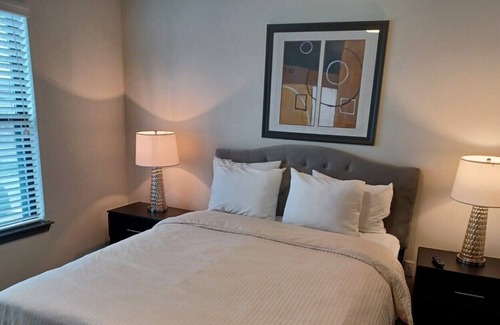Queen bed with flat screen TV + Roku and Wifi! Washer/Dryer in the apartment, great location, secured building with plenty of parking space! Fully equipped kitchen with cookware and bakeware ready to go!