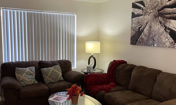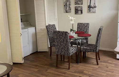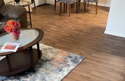 Apartment includes, all utilities, free reserved covered parking space, and free WiFi service with cable. Housekeeping is offered once a week. Enjoy meals in our fully equipped kitchen that includes coffee maker, tea kettle, utensils, plates, cups, towels and linens. Each bedroom has a queen size bed and large dressers to store away your personal items during your stay. Beat the summer heat in our sparkling and refreshing pool or relax in our hot tub after enjoying the sites in our beautiful desert oasis.