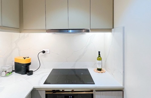 A luxury condo unit with a modern contemporary interior, fully furnished to European standards.