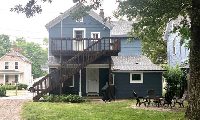 Outdoor space including covered front porch with rockers, rear private patio with dining table and Weber gas grill. A great rear yard with picnic table and fire pit. Small Dog Friendly with refundable pet deposit and nightly pet fee.