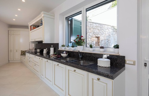 Highest quality heated porcelain Italian flooring in the living area compliments perfectly the stone carved fully functional fireplace. The entire villa is also fully air-conditioned, and heated using the most modern systems making it very comfortable for your stay even in the winter months.