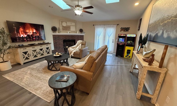 Our home is designed for comfort and convenience, sleeping up to eight guests with a king bed, two queen beds, and an additional full size rollaway bed. You'll find a fully stocked kitchen with all the essential cookware and appliances, making it easy to prepare meals for your group. Relax in the inviting living area, or step outside to enjoy the peaceful neighborhood. Feeling nostalgic? Play the included retro arcade games.