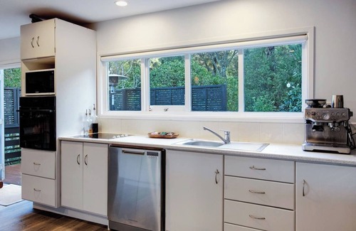 The pretty two-bedroom home is set on a large section that boarders native bush, so you will see lots of birdlife. With both sides of the house having indoor/outdoor flow you can follow the sun or shade, based on your personal preference.