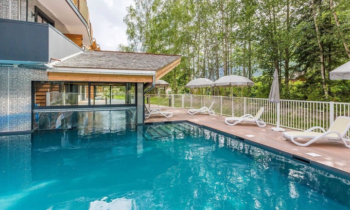 The Résidence with authentic and at the same time contemporary architecture welcomes you with comfortable and attractively furnished apartments. They all have a terrace or balcony with furniture. For relaxation after an active day of vacation, the heated, semi-covered pool and a wellness area (the latter for a fee). To reach the center of the village, you just have to take the bus, which stops right in front of the residence. The different types of apartments include: - 2-room apartment for 4 people (FR-74400-159) - 2-room apartment for 4/5 people (FR-74400-160) - 3-room apartment for 6 people (FR-74400-161) - 3-room apartment for 6/7 people (FR-74400-162)