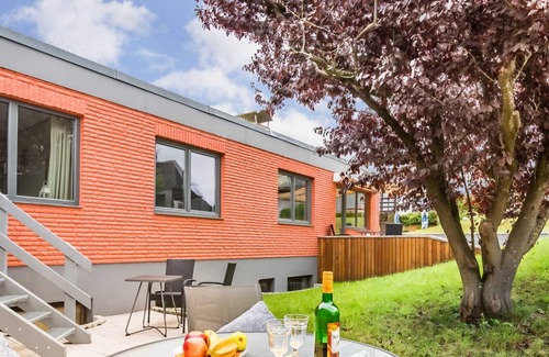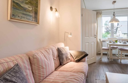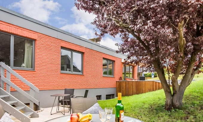 The large bedroom has a double bed (160x200) and a terrace access to the stylish garden with garden furniture and sun lounger. One bedroom is furnished with a single bed (90x200). There is also a fire pit / grill area, which can be shared with other guests.