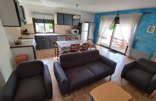 Description: On one level with a living room-kitchen (insert fireplace - TV - Dishwasher) opening onto a terrace with small garden (garden furniture - Barbecue). 2 bedrooms (2 double beds - 3 single beds), 2 shower rooms - WC. Storeroom with washing machine and dryer. Electric heating in all rooms.