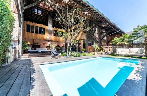 Accommodation: The large living room with its large windows offers a pleasant view of the exterior, allowing to keep an eye on the children while enjoying moments of relaxation. The fully equipped American kitchen, open to the terrace, facilitates the preparation of meals with the family. Five large comfortable rooms for peaceful nights: each decorated with care to offer everyone a pleasant and intimate rest space after a busy day. - 5 bedrooms: 2 double beds 180cm (parental suite with ensuite bathroom), 2 double beds 160cm and 1 double bed 140cm- Several bathrooms including a bathroom adjoining the master suite- Equipment designed for the whole family: Stay connected thanks to the wifi and enjoy peace of mind with two secure parking spaces.Land of 200m2 Located just a 5-minute walk from the heart of the city, this former industrial bakery workshop has been transformed into a dream place to accommodate your big family or group of friends up to 10 people. With its large spaces designed for conviviality and secure swimming pool, it is the ideal place to create precious memories together. Prepare yourself for moments of joy and sharing in this 7 room holiday home; a huge semi-covered terrace, a real oasis of happiness: while the children will enjoy safely in the large swimming pool of 7x3 depth 1m50, you can relax on many armchairs and deckchairs. Family meals will have a special flavor thanks to the plancha and the friendly tables installed in the sun. A spacious and bright interior to meet. Price Includes: Sheets, towels, cleaning, heating