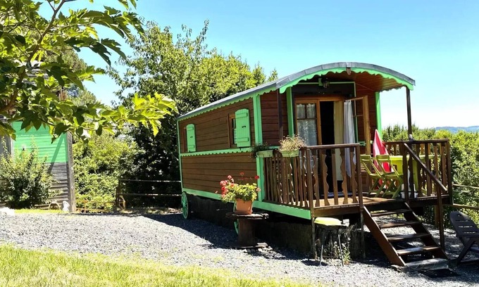 Accommodation: INSOLITY ACCOMMODATIONOur wooden trailer with its terrace offers an unusual and moose stay. Equipped with a kitchen, a 2 bed bench in 90, a bedroom with a bed in 160, a bathroom (shower) and WC, it offers all the comfort in a reduced space (22m2).Reversible air conditioningOutside, you enjoy the swimming pool (outside ground / 4mx3m - 1.30m depth) shared with the guests of the cottage Charlotte (2 pers) and the owners (pool open from 01/07 to 30/09)Free Electric VELOS loan (x4 / free / with helmets and baby seats) PETANQUE TERRAINThe price includes:LinenBed linen (sheets)Toilet linen and bathrobeElectricity up to 8kWh/day (beyond charging)The price does not include:End of stay cleaning package 50€ Stunning views of the countryside, calm and rest assured!An on-site fishing pond will also make the amateurs of this practice happy.We are on the limit of 3 departments : Corrèze, Dordogne, lot : All near Terrasson, valley of the vezère, caves of Lascaux, Sarlat, Périgueux, Brive, Pompadour, collonges la Rouge, Rocamadour and the gulf of PadiracCows, horses, hens, rabbits, dogs and cats are life in the country!Possibility to order the meal : 26€/adult Price Includes: LinenBed linen (sheets)Toilet linen and bathrobeElectricity up to 8kWh/day (beyond charging) The Price Does not include: The cleaning package at the end of stay : 50€