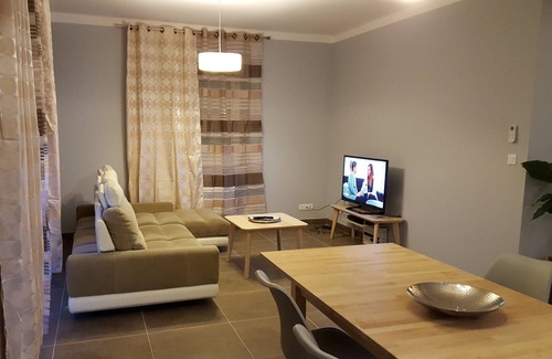 In the living room you will find a corner sofa, a dining table and a flat screen, the kitchen is fully equipped with hob, oven, microwave, fridge, coffee maker, toaster, dishwasher, washing machine, cooking utensils and dishes. Bath and bed linen is available on site.