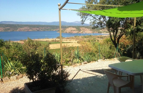 Cottage in stone and wood with iron pergola panoramic view of Lake Salagou, on the edge of the charming wine village of Liausson, a pedal mountain bike trails and hiking trails