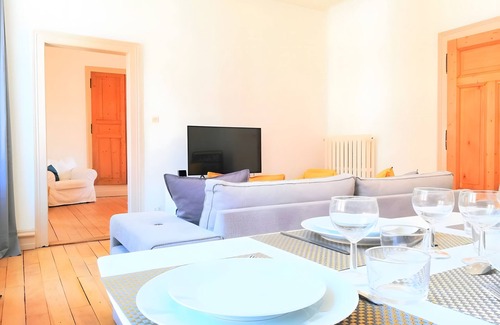 The "Street'Art" gîte is on the 2nd floor, very bright, and offers a total area of 52 m² with a ceiling height of 3.20 m. It includes a kitchen equipped with an oven, 4-burner hob, extractor hood, coffee machine, kettle, toaster, a bathroom, a toilet, a spacious 20 m² bedroom with a 140x190 double bed and a built-in wardrobe. The 25 m² living-dining room has a table and chairs for 6 people, a sofa bed (150x200), 2 bunk beds (90x200), a large-format TV with streaming service, and free WiFi access.