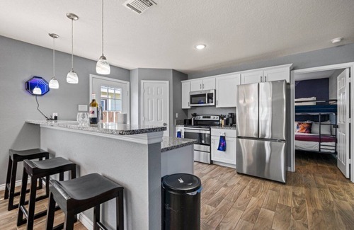 ↪ Whip up galactic gourmet meals with stainless steel appliances, including a refrigerator, stove, and microwave.