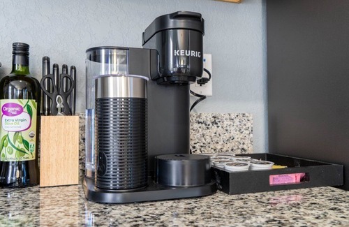 ↪ Kick-start your mornings at our coffee station, complete with a Keurig machine.