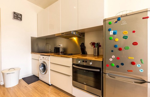 The electric kitchen is equipped with fridge, microwave, oven, freezer, crockery/cutlery, kitchen utensils, coffee maker and toaster.
