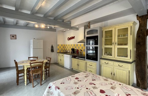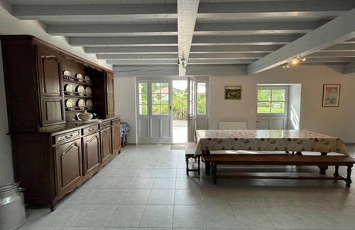Splendid house of character, charm of beams and restored old stones, combining comfort and modern equipment with old family furniture. 6-seater SPA available all year round under the covered terrace. Ground floor: large living room of 70 m2 including the fitted kitchen (induction hob, pyrolysis oven, microwave, fridge-freezer, dishwasher), living room, lounge area (large screen TV, internet box, hi-fi radio CD). 1 bedroom (1 double bed), shower room (shower, 2 sinks), separate wc. Cellar (washing machine, dryer). Upstairs: 2 bedrooms (2 single beds, 1 double bed). Bathroom (corner bath, double washbasin), wc. Mezzanine with 1 single bed, 1 sofa bed, 1 billiard table and 1 table football. 1 cot. Possibility 8 people. Unenclosed land 3000 m2 (gate on the street side) bordered by a small stream, 2 terraces, one of which is covered with SPA, garden furniture and plancha. Sun bathing. Heating with fuel in supplement (package 8.5 €/day). Possibility to rent sheets. Cleaning deposit €100.