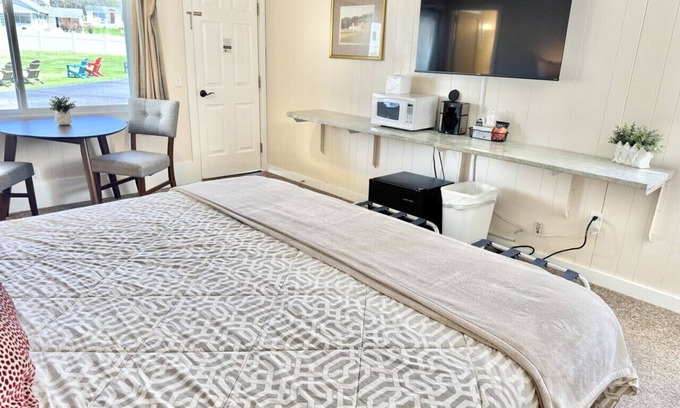 This comfortable king room features a full bathroom, dedicated parking, and amenities including a microwave, refrigerator, free wi-fi, and a Smart-TV. Also included is a large common greenspace with lawn chairs, propane grills, and a private dog-park. An ocean beach, several restaurants, a general store, and a specialty wine and cheese shop are within easy walking distance. Come experience the stunning natural beauty of Mount Desert Island, home to breathtaking landscapes, charming seaside villages, and an array of outdoor activities. Our comfortable and affordable accommodations provide the perfect home base for your adventures, whether you're hiking through Acadia National Park, whale watching off the coast, or simply strolling through the quaint streets of Bar Harbor. At Gallagher's Travels, we pride ourselves on providing exceptional customer service and ensuring a comfortable and relaxing stay for each and every guest. Our motel rooms and cozy cabins are equipped with modern amenities to make you feel right at home, and our friendly staff is always available to assist with any needs or recommendations. Don't miss out on the opportunity to create unforgettable memories in one of the most beautiful destinations in the United States. Book your stay at Gallagher's Travels Motel and Cabins today and let us help you make the most of your trip to Bar Harbor and Acadia National P