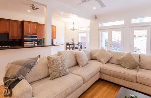 This spacious and stylish house in uptown Houston will be your home away from home. This house features a fully equipped kitchen, as well as a spacious living room perfect for entertaining or relaxation. Keep on top of work in the dedicated office or enjoy quality time in the second-floor lounge. At the end of the day, relax in the n in-ground pool and waterfall. Luxurious bedrooms including a master suite with walk-in closet. House is equipped with elevator.