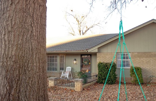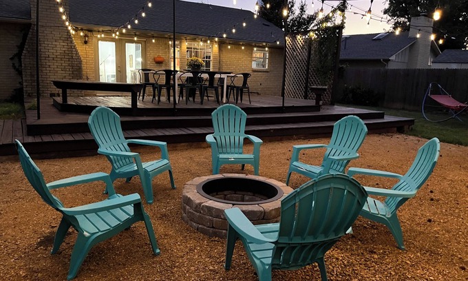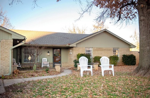 Nestled in an idyllic cul-de-sac location in the ❤ of Norman and only 5 minutes from OU's campus, this freshly remodeled 2100 sq ft home is the perfect home base for families. Relax together in the BACKYARD RETREAT with a firepit, deck, patio dining, string lights, grill, mini-soccer field, swing set, rocking hammock and more. Play in the garage GAME ROOM with shuffleboard, ping-pong, foosball, giant Connect 4, and more. Entertain yourself with our Nintendo 64, Super Nintendo, smart TVs, and our outdoor projector. Enjoy our colorfully decorated home all to yourself, use our fully stocked kitchen and laundry as needed, and stay safe with our in-home armored closet tornado shelter.