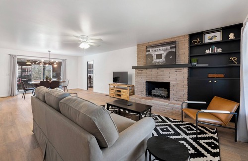 Experience modern comfort in this recently updated house complete with a private parking area and patio. Relax in the spacious living room featuring a comfy couch and a 50-inch smart TV with your favorite streaming apps. Adjacent is the dining area with seating for 6. The fully equipped kitchen has everything you need to whip up a meal, from pots and pans to baking sheets and utensils, to a blender and a Kuerig coffee pot.