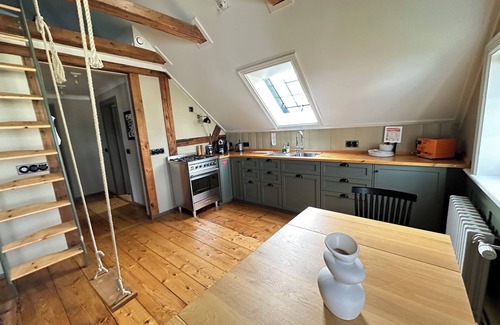 Upper Floor Apartment North : The upper floor has a private entrance . The North apartment features a swing in the living room. We have one Bedroom with a King Size bed (180x200 cm) that can be converted into two single beds (90x200 cm). The bathroom has nice shower, in the living room we have a comfortable sofa that converts into a Queen Size bed (160x200 cm). Kitchen is fully loaded with everything you need.