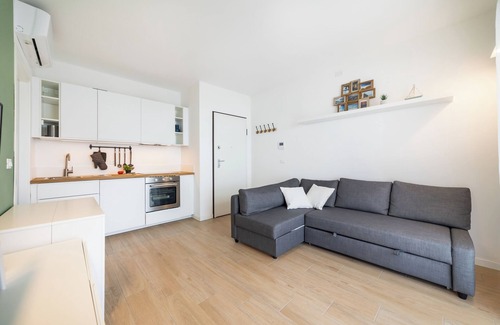 Inside, the rooms are bright, the furnishings are modern: clean and linear. The entrance leads immediately into the living room with a wall kitchen where there is also a sofa (which can be transformed into an additional double bed if necessary), placed in front of the television.
