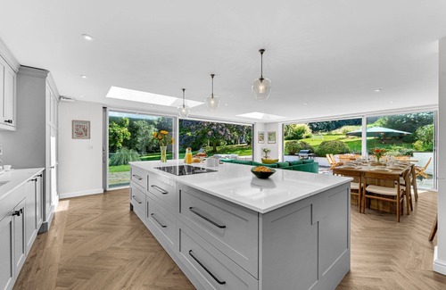 The huge, bespoke kitchen/living/dining room is the heart of the home and is fully equipped with everything you'll need to self-cater, including three ovens, a dishwasher, a fridge/freezer and a Delonghi coffee machine. Enjoy delicious meals around the ten-seater dining table or a quick bite to eat at the three-seater breakfast bar. Once replenished, choose from two lounge areas, one with a corner sofa overlooking the huge mature gardens and the other with an L-shaped sofa, two armchairs and a Smart TV complete with Netflix.